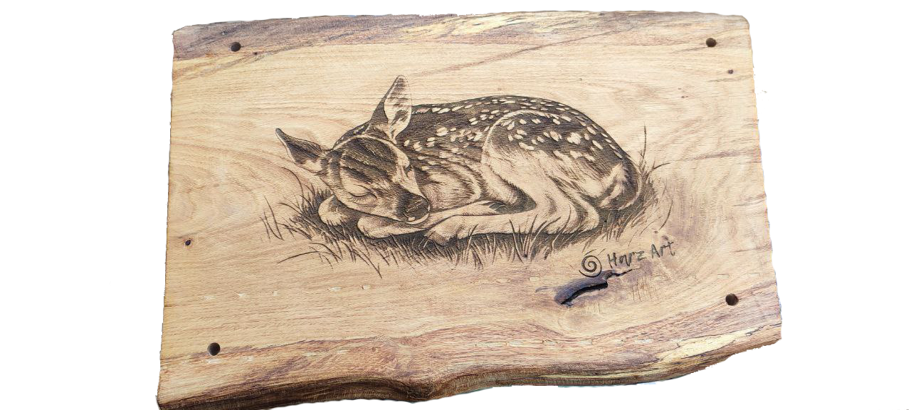 Hierbei handelt es sich um eine wunderschöne Gravur mit Tiermotiv auf einem antiken, wieder aufgearbeiteten Eichenbrett mit den Endmaßen von ca. 55 x 30 cm sowie einer Gravur von ca. 30 x 20 cm.